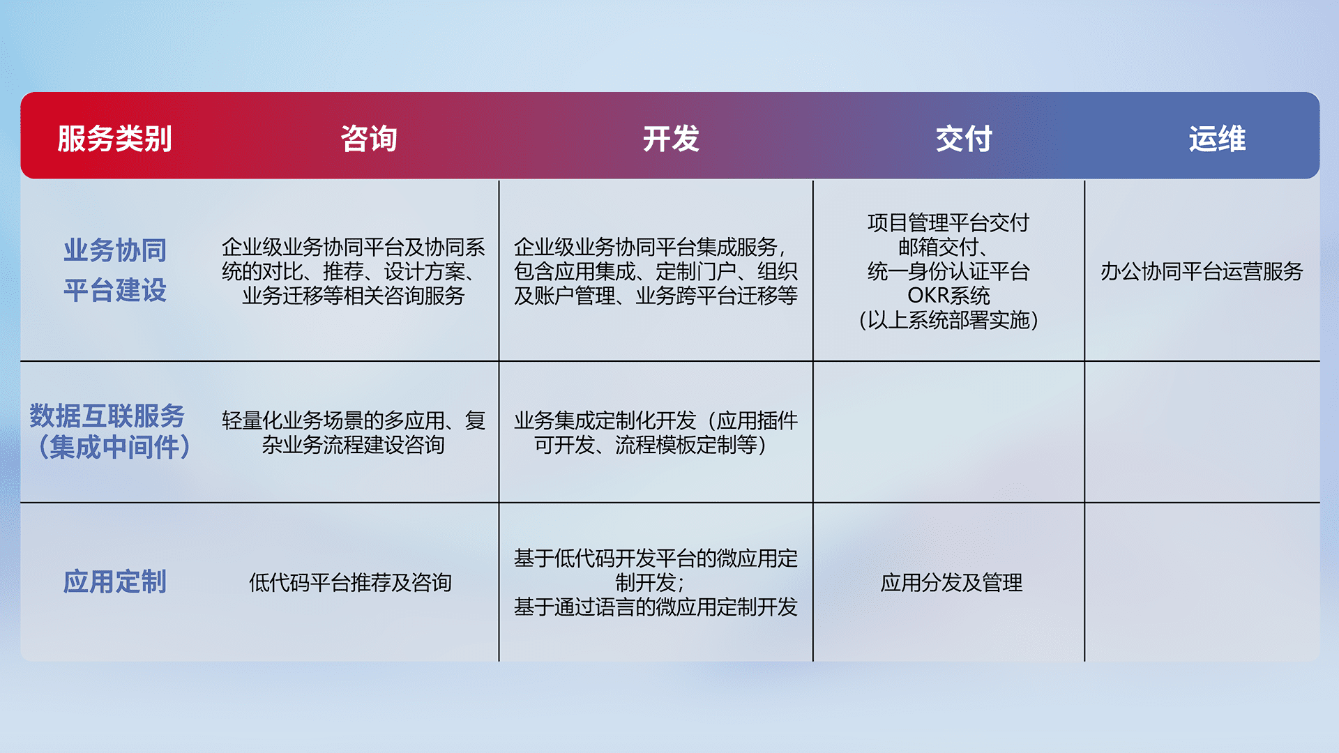 针对钉钉、、、、企微、、IDaas等平台级产品提供产品的规划、、、方案、、、交付、、、、定制化开发等服务,,,,实现如统一协同办公、、智能客户服务、、、混合会议管理、、、智能数据查询、、等业务场景,,,实现数字化转型。。